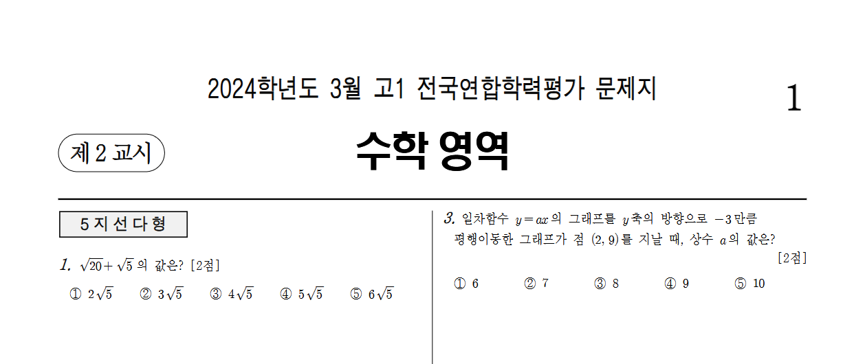 2024학년도 3월 고1 전국연합학력평가(3월 모의고사)는 고등학교 진학 후 처음으로 치르는 중요한 시험입니다. 이 시험은 중학교에서 배운 내용 위주로 고등학교 공부의 출발선을 점검하는 기회로, 학생들의 학습 수준을 파악하고 향후 학습 방향을 잡는 데 도움을 줍니다. 이번 글에서는 2024년 3월 고1 모의고사의 문제지, 정답, 해설 모음을 제공합니다.